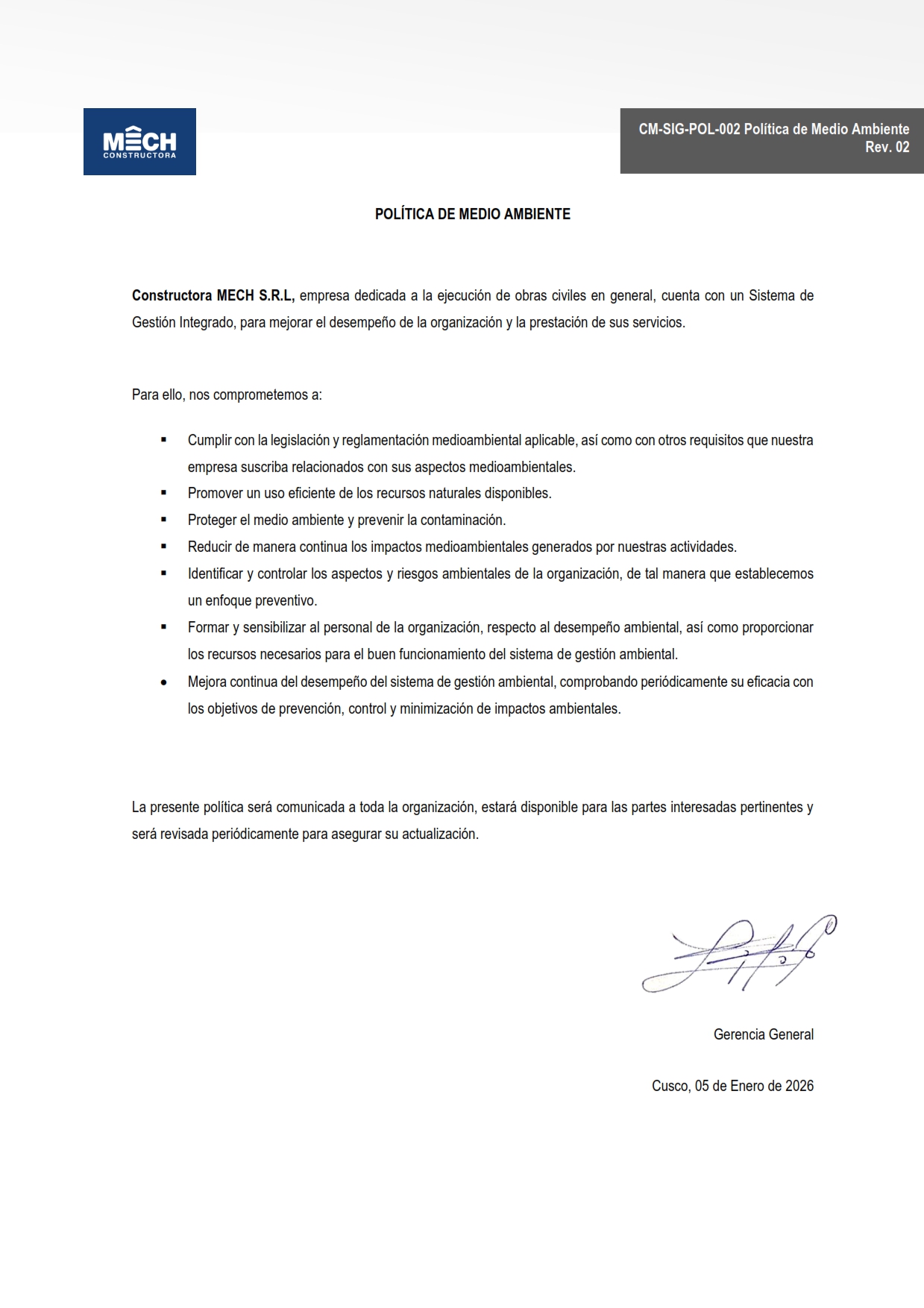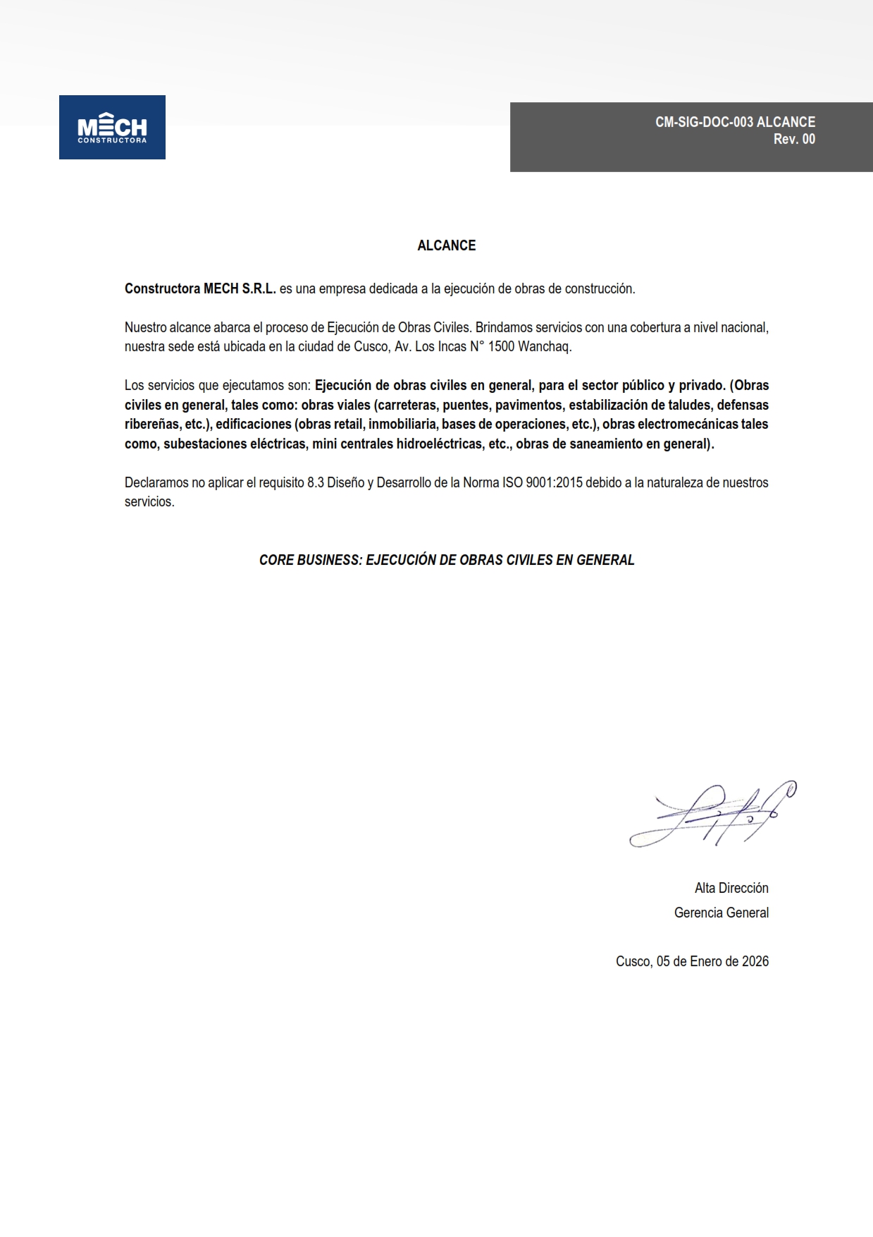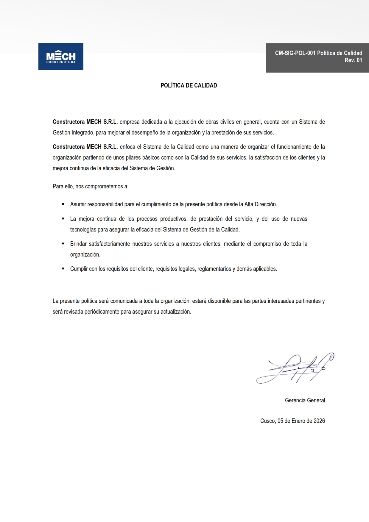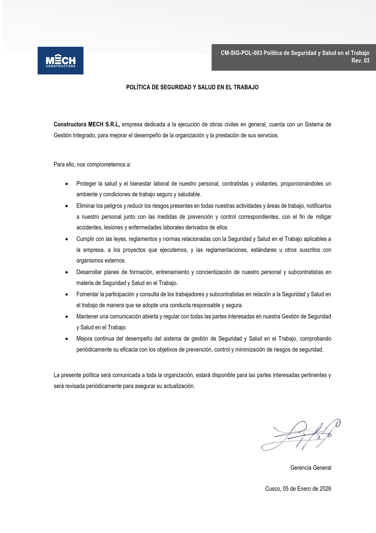 Constructora MECH, es una empresa cusqueña con 30 años de experiencia en el mercado; dedicada a brindar servicios de ejecución de obras civiles en general, tales como construcción y mantenimiento de carreteras, edificaciones, centros de salud, campamentos, bases de operación, subestaciones eléctricas, defensas ribereñas; manteniendo los estándares de seguridad, calidad y cuidado del medio ambiente; ofreciendo compromiso e identificación con los clientes.